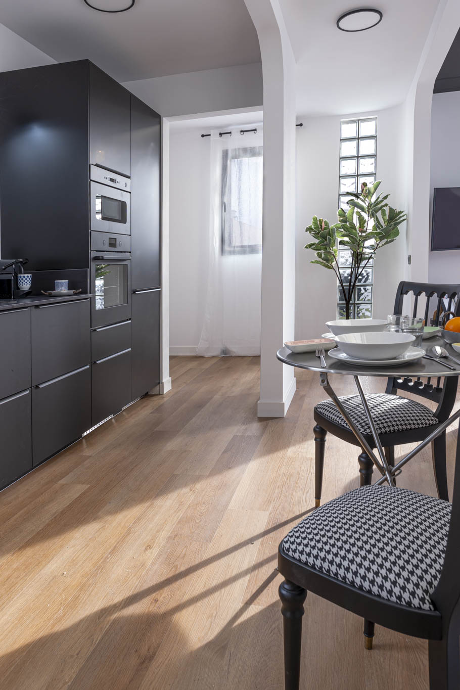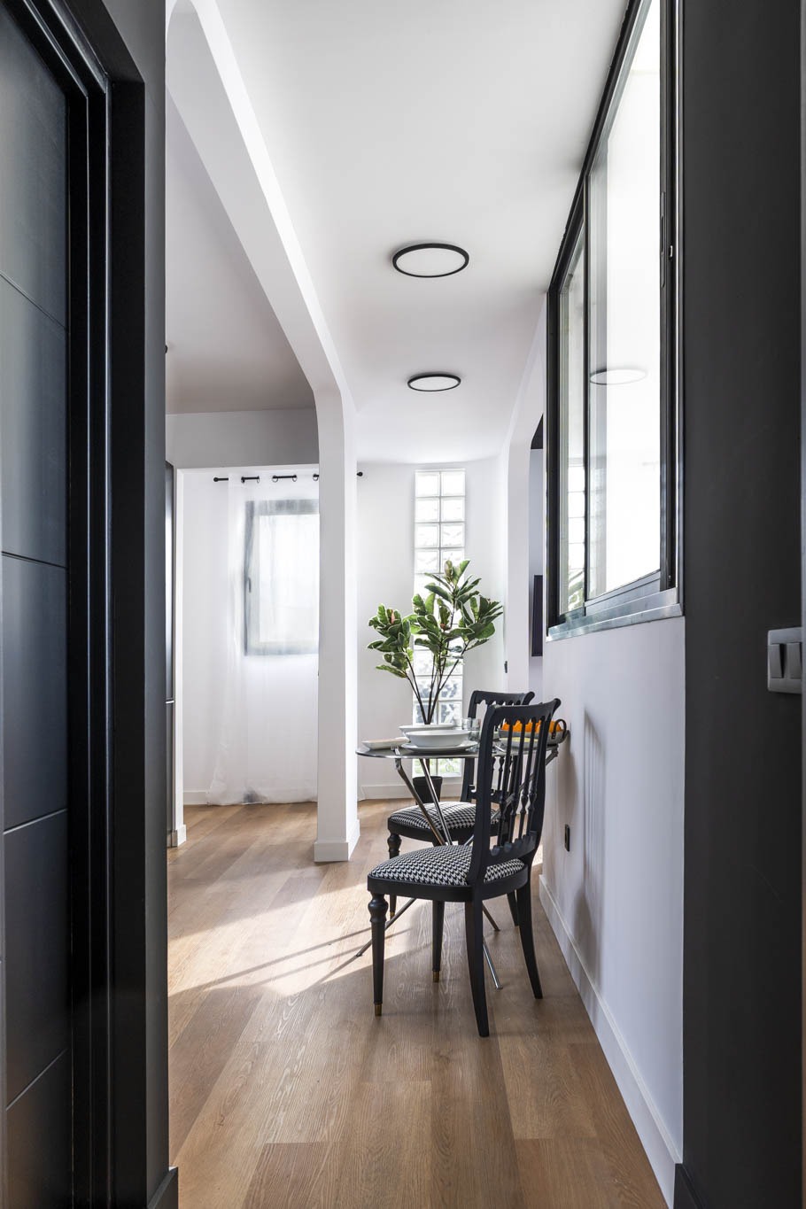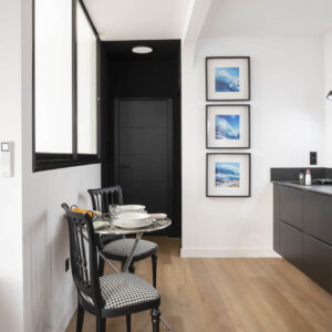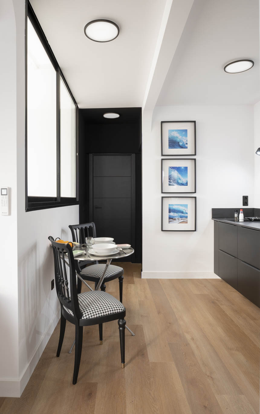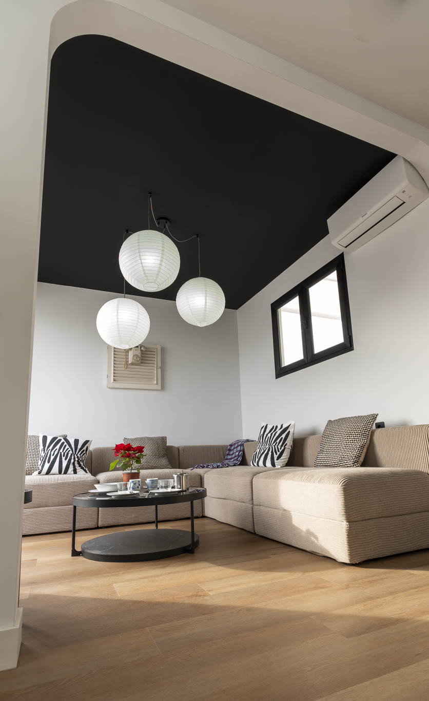 La decoración es una mezcla entre minimalista y contemporánea, además, teniendo como referencia el color negro, el cual les gustaba a los propietario. Conseguimos ubicar el negro zonas donde aportara carácter pero sin restar luminosidad.