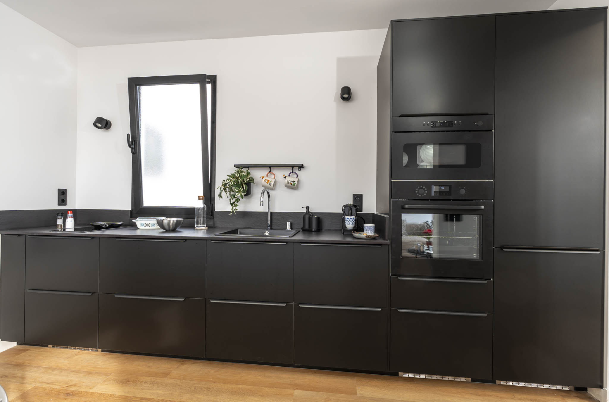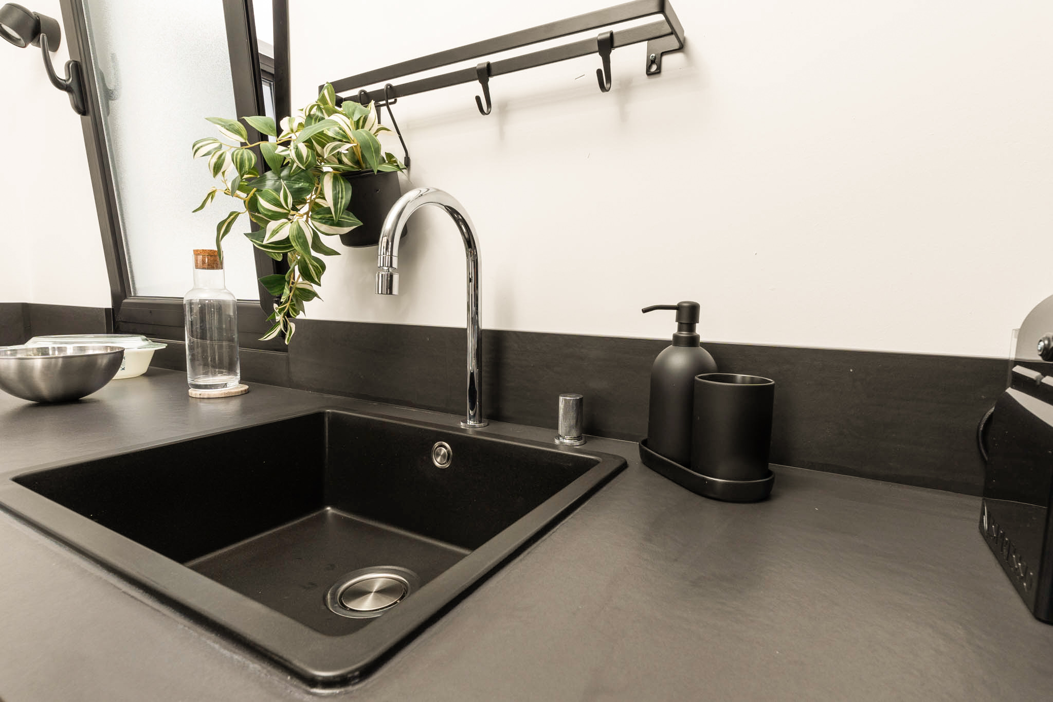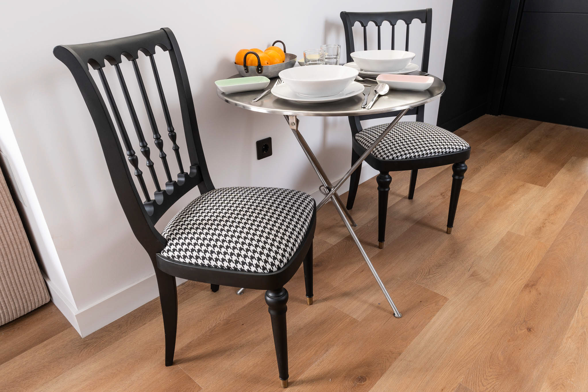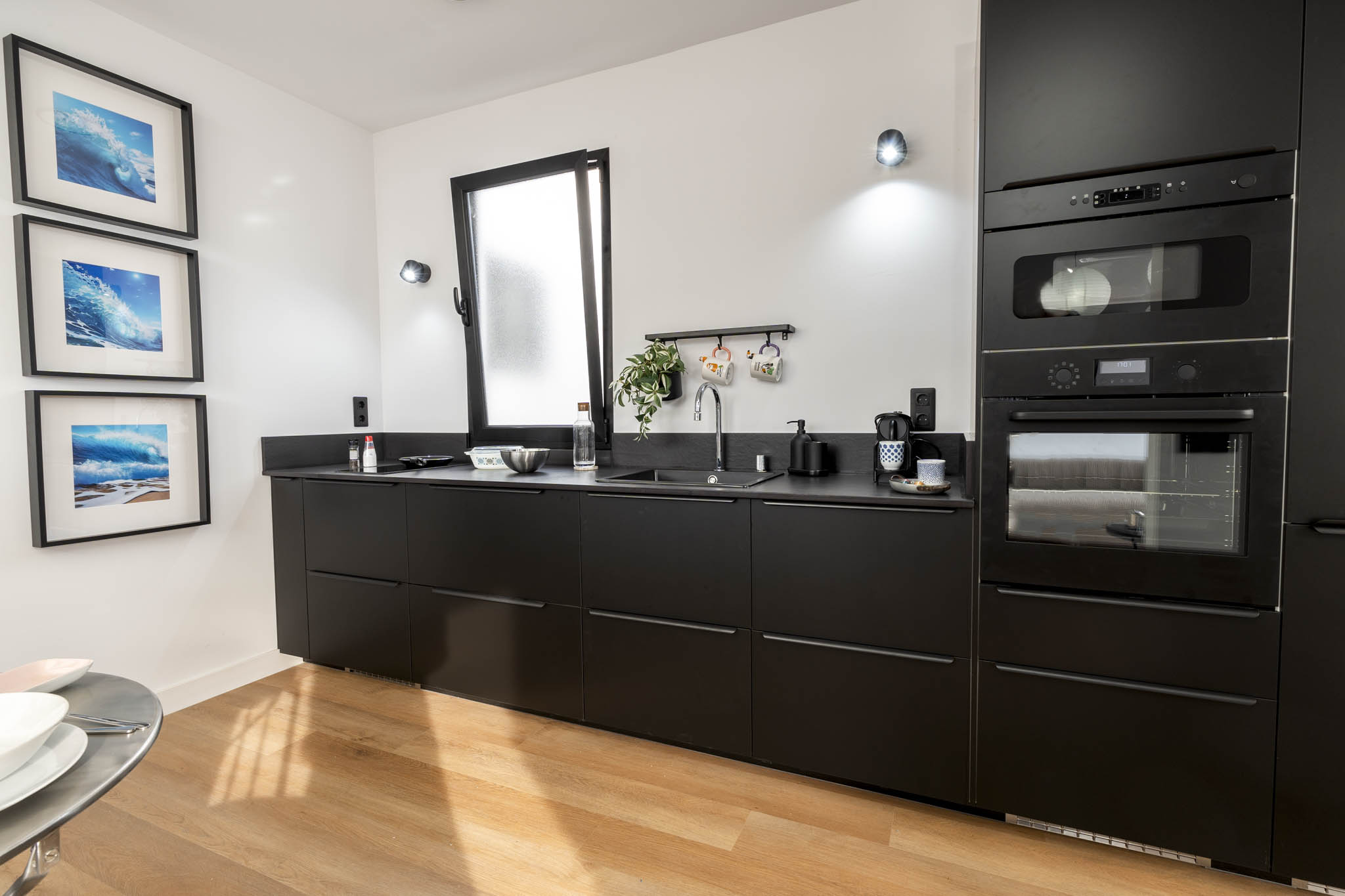 La decoración es una mezcla entre minimalista y contemporánea, además, teniendo como referencia el color negro, el cual les gustaba a los propietario. Conseguimos ubicar el negro zonas donde aportara carácter pero sin restar luminosidad.